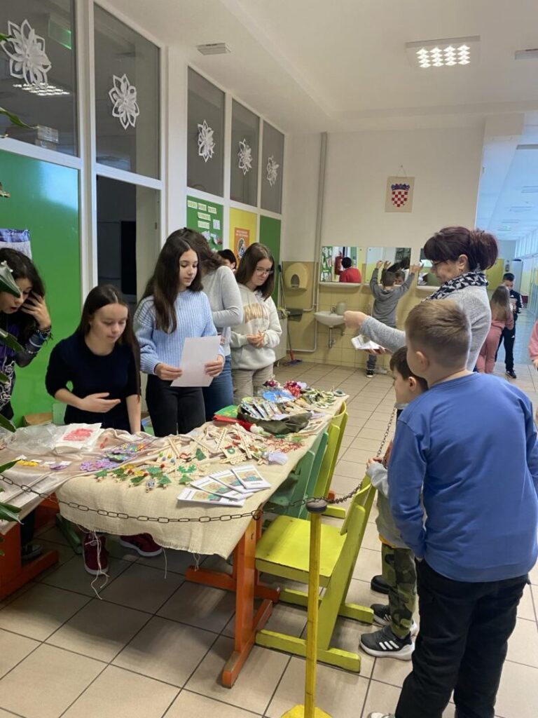 Školski hodnici pretvorili su se u pravi mali sajam – stolovi su bili ukrašeni šarenim kuglicama, ručno rađenim ukrasima, svijećnjacima, čestitkama i raznim dekoracijama koje su privlačile pažnju učenika, učitelja i roditelja. Svaki je predmet nosio osobni pečat mladih autora.